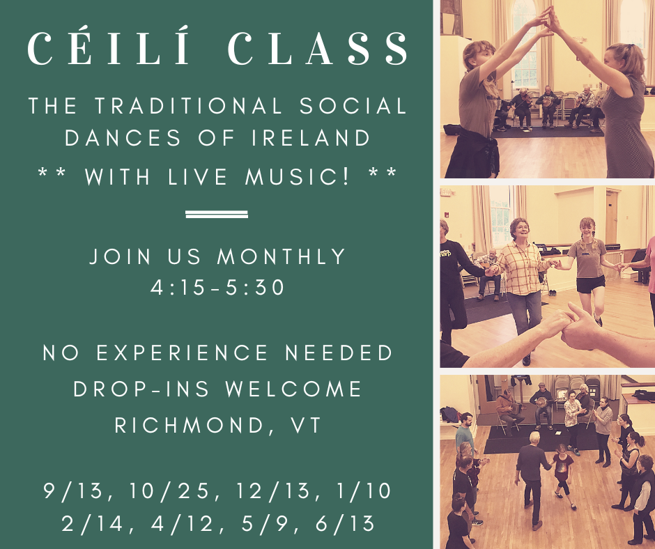 We are not teaching weekly classes this year, but we are continuing our popular monthly drop-in ceili classes in Richmond, VT with live music from One More Time! View event details and updates on our Facebook page or down below.